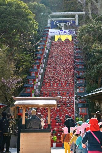 写真日記人気ブログランキングに参加中 ポチッと ↑ 応援お願い致します 今夜からの春の嵐予報を前に、今日は午前中に勝浦市が街ぐるみで取り組んでいるひな祭りを訪ねてきました。最初に、いくつかあるひな飾りの有名スポットのうち、遠見岬神社の石段、覚翁…